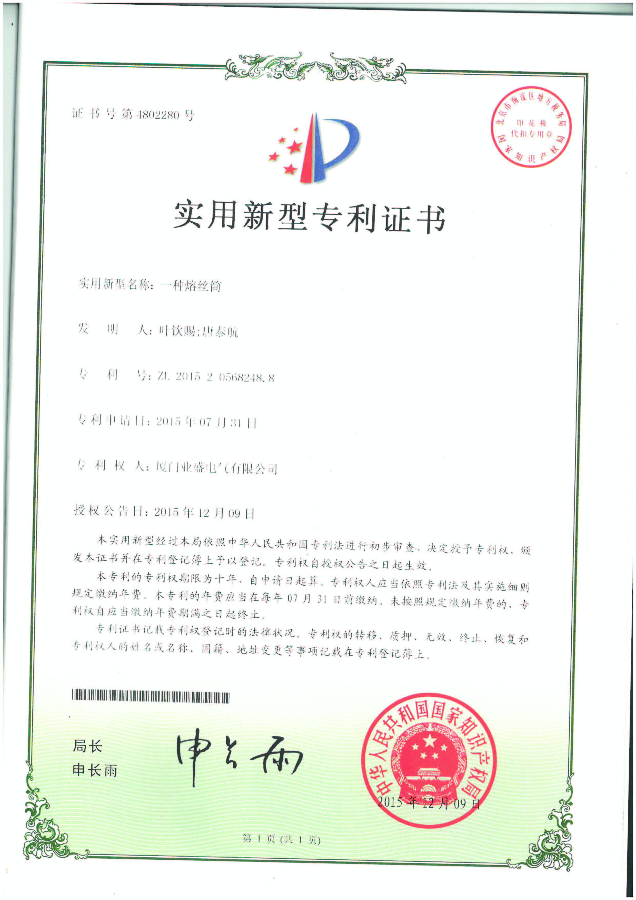 實(shí)用新型專利證書